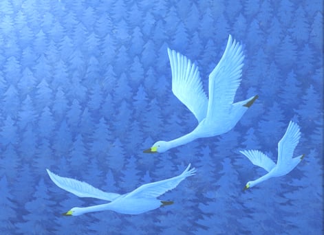 ふと、母が物置から見つけてきたものですが、この夜明けに飛ぶ白鳥の絵が、なんとなく令和を迎える気分に重なったのでアップしました。